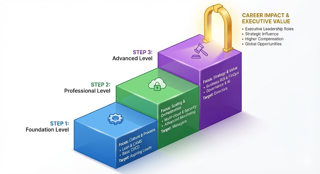 | DevOps Leadership | Advanced | Senior leaders | Multi-team oversight | Strategy, governance | Third | Certified DevOps Manager |